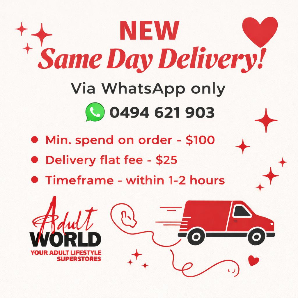 Adult World now offers same day delivery via WhatsApp — fast, discreet and easy.